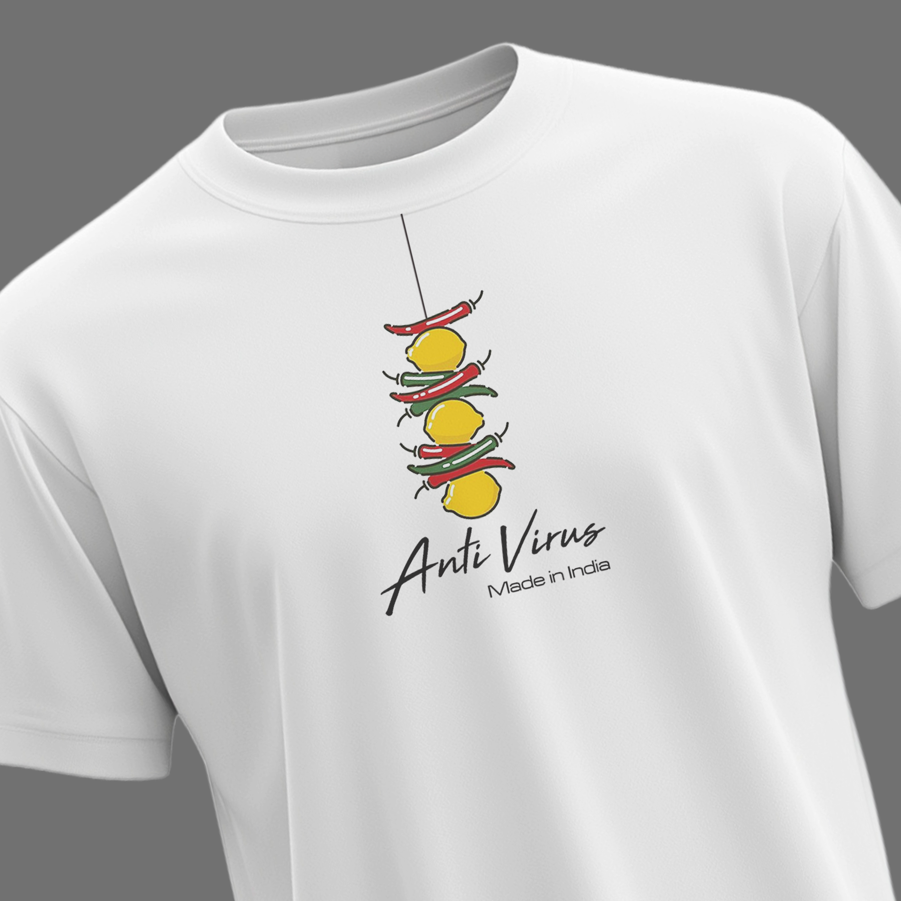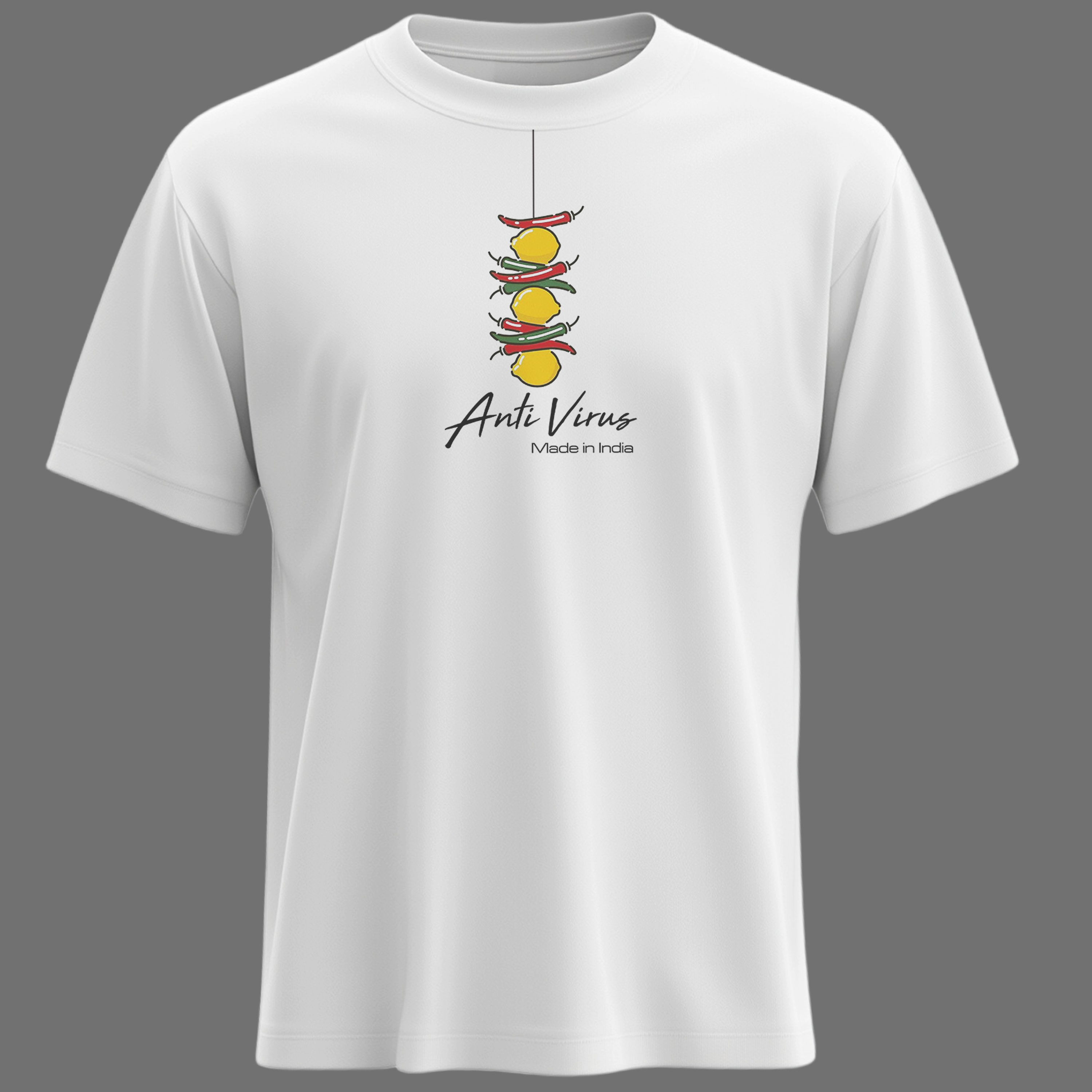 [Anti Virus T-Shirt, Made in India T-Shirt, Unisex Graphic Tee, Indian Heritage Streetwear, Lemon Chili Design, Cultural Inspired Clothing, Trendy Unisex T-Shirt, KLOCH Apparel, Quirky Graphic Tee, Urban Fashion India.]