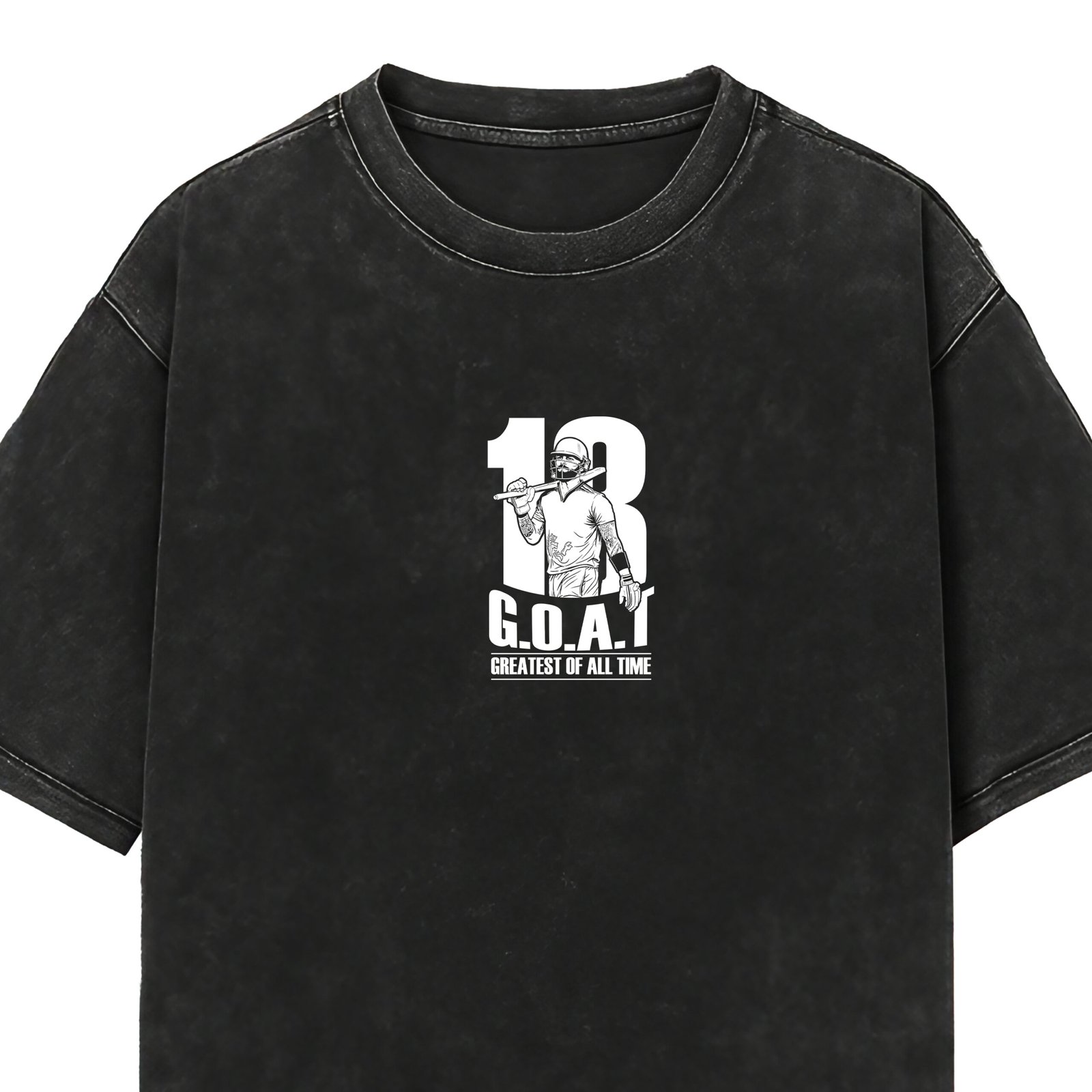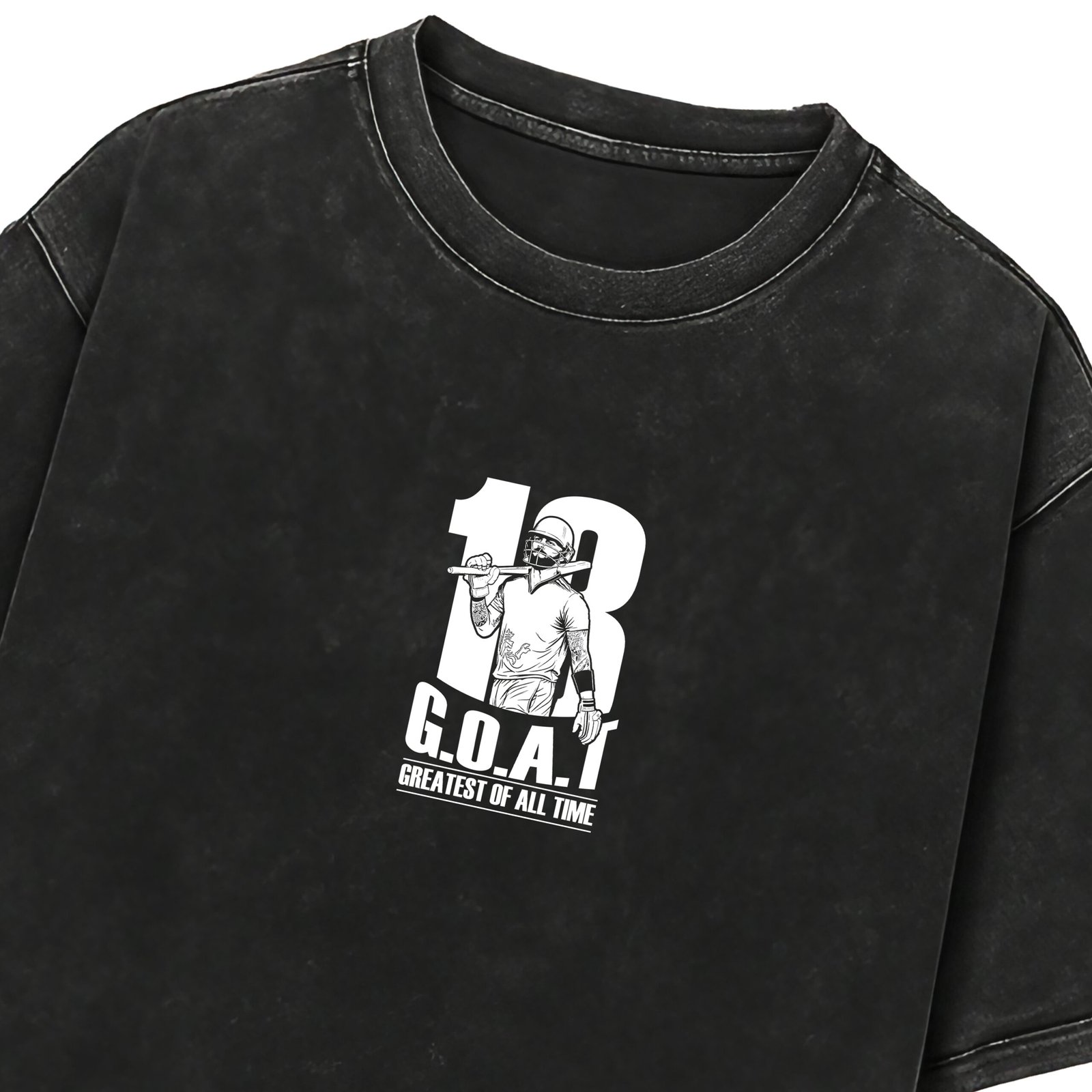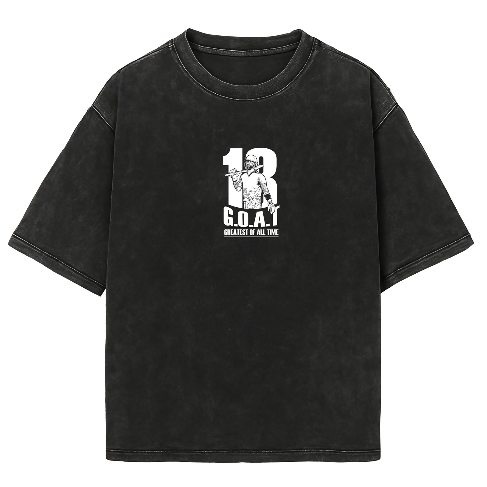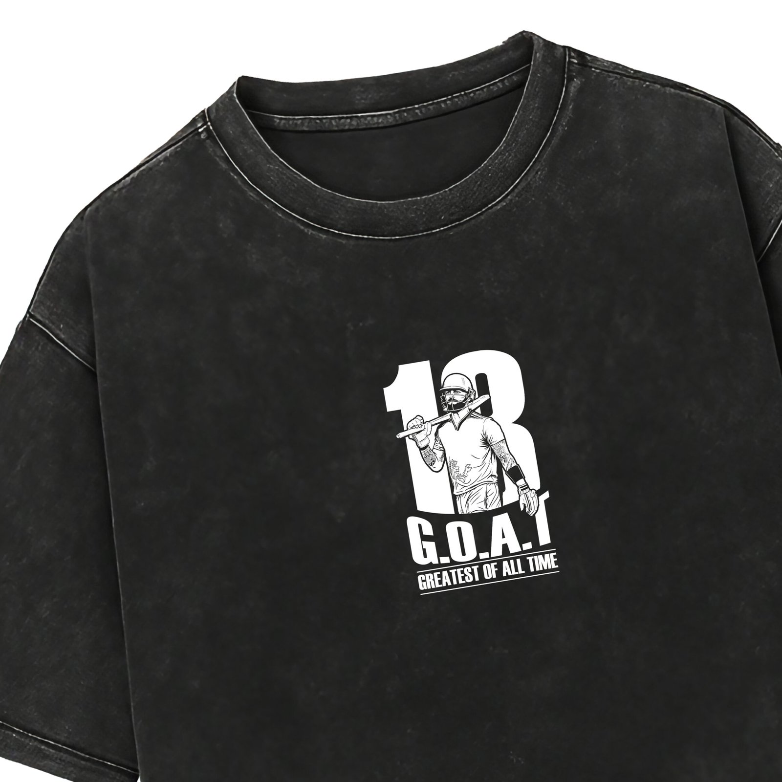 This “18 G.O.A.T – Greatest Of All Time” acid-wash T-shirt is a tribute to the legacy of Virat Kohli – a symbol of passion, dominance, and consistency.