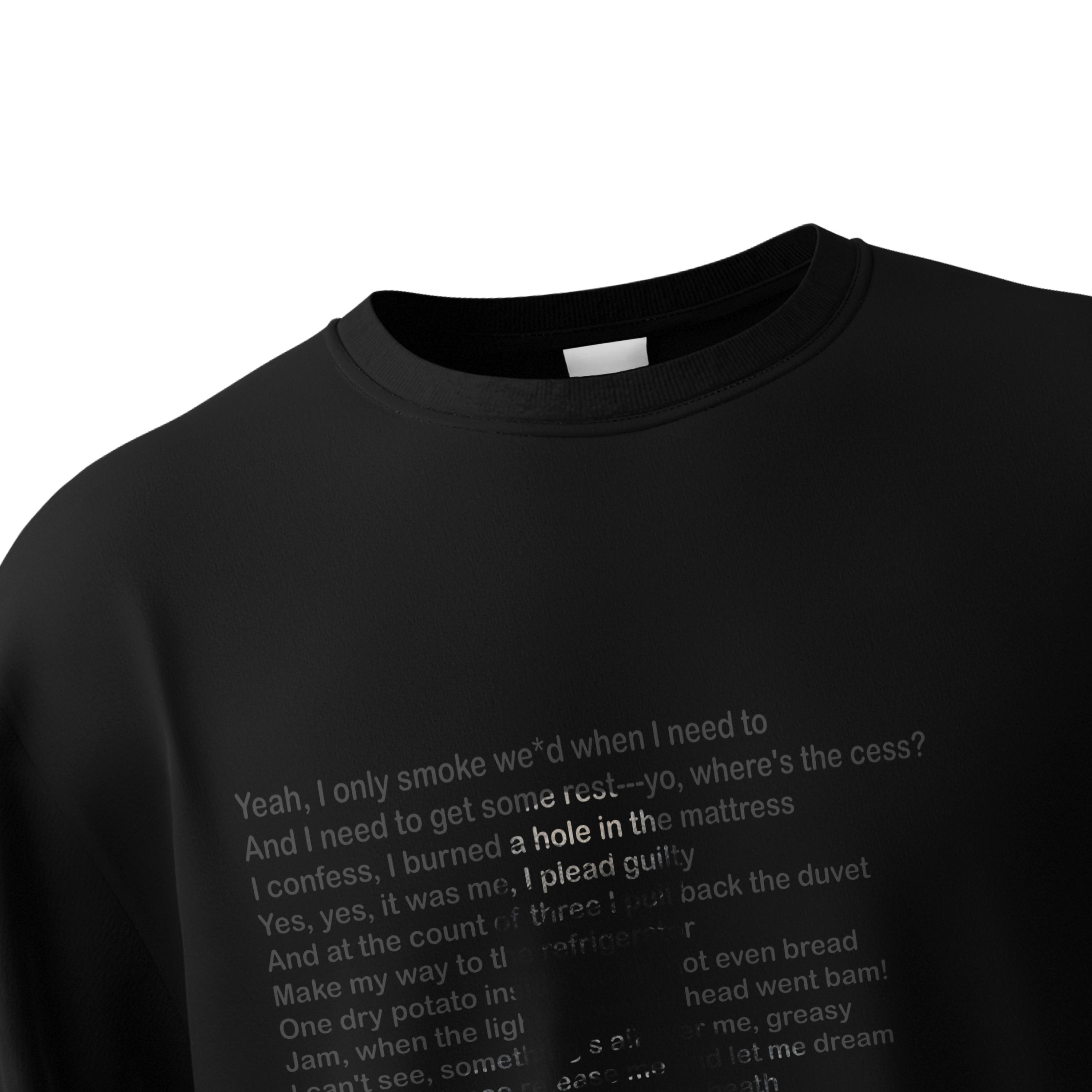 Buy the INSOMNIA Lyrics Unisex Oversized Tee in black at Kloch.in. Made with 180 GSM 100% cotton, oversized fit, and minimal tonal graphic. Premium streetwear for men & women. Shop now!